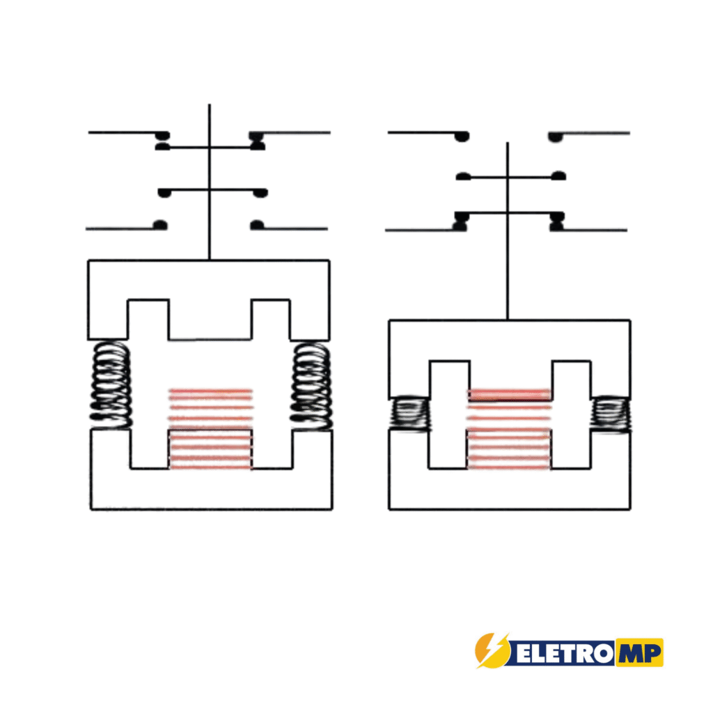 • Ao energizar a bobina, o campo magnético interno do contator é criado, fazendo com que os contatos principais se fechem.